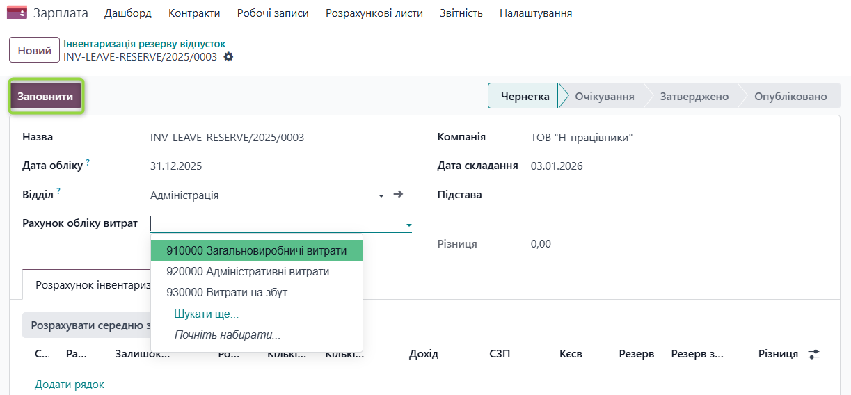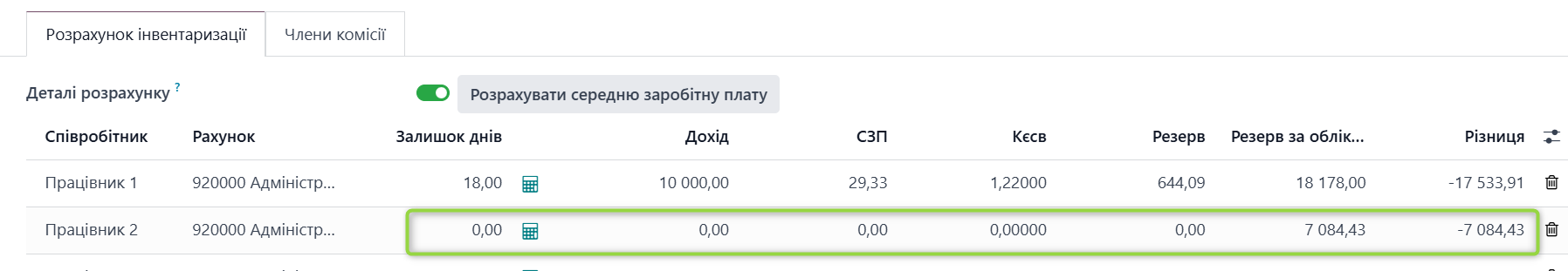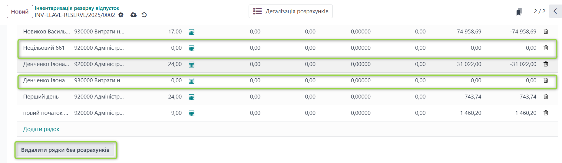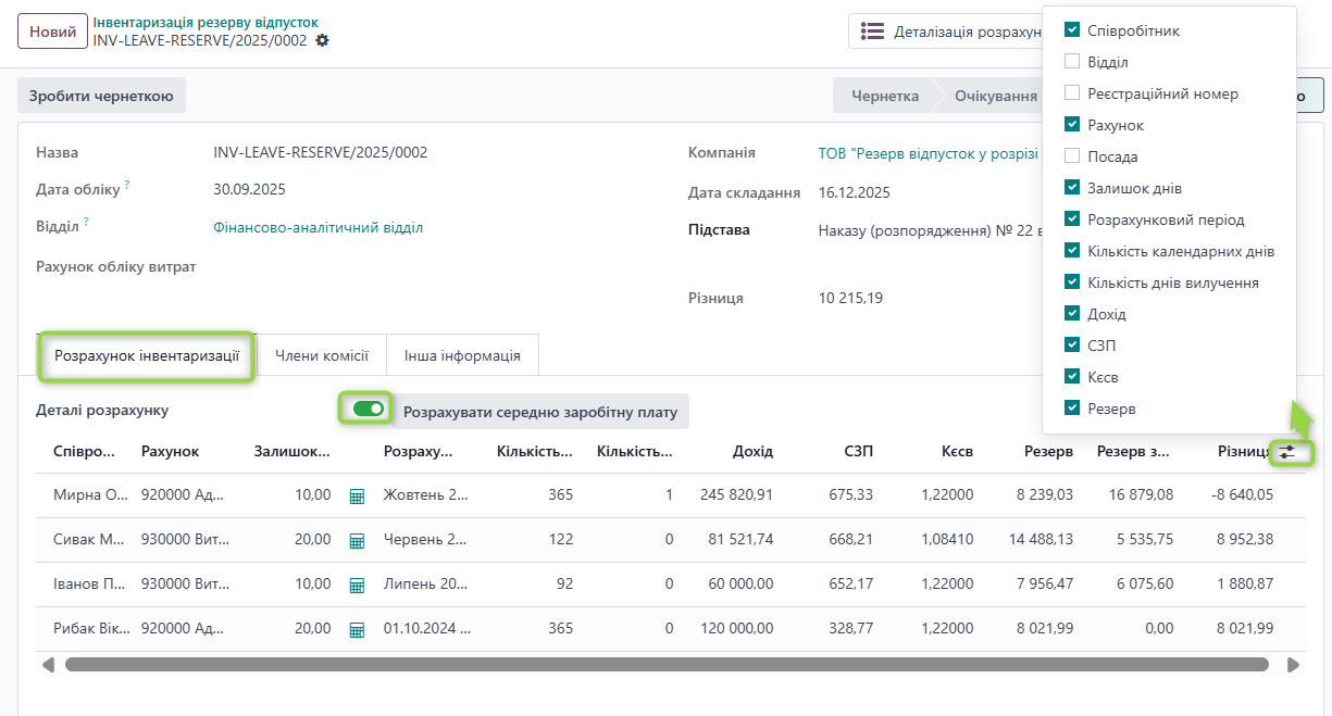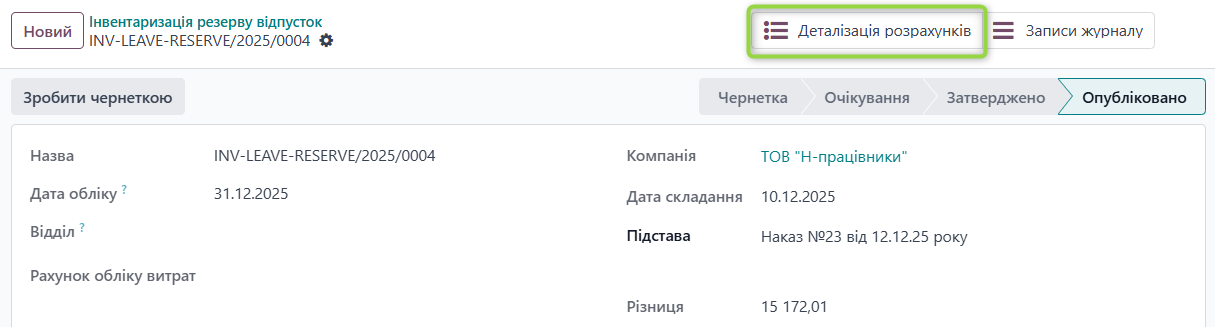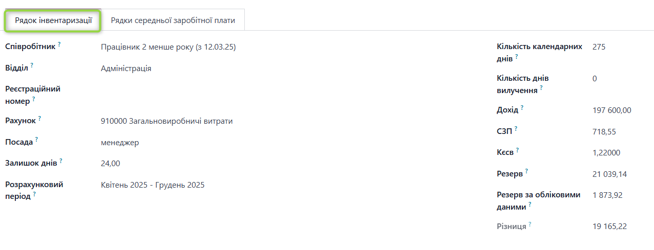 Якщо у працівника відсутня кількість невикористаних днів відпустки (Залишок днів=0), система не виконуватиме інвентаризаційний розрахунок для такого працівника, оскільки сума резерву становитиме 0. Водночас якщо за цим працівником існує обліковий залишок резерву, система відобразить його у розрахунку, щоб забезпечити коректне подальше коригування.