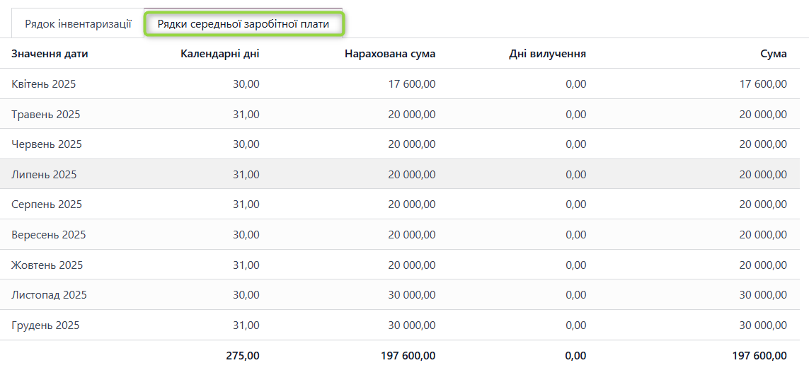 - За вкладкою "Рядки середньої заробітної плати" - детальна аналітика по розрахунковому періоду та нарахуванням для розрахунку СЗП працівника