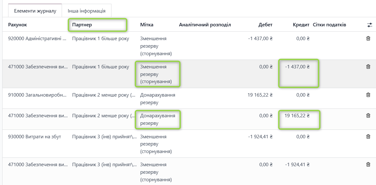 Для кожного такого коригування створюється окремий бухгалтерський запис журналу, що відповідає вимогам ведення кореспонденції за рахунком 47100 «Забезпечення виплат відпусток» у випадках, коли аналітика по партнеру (працівнику) відсутня.