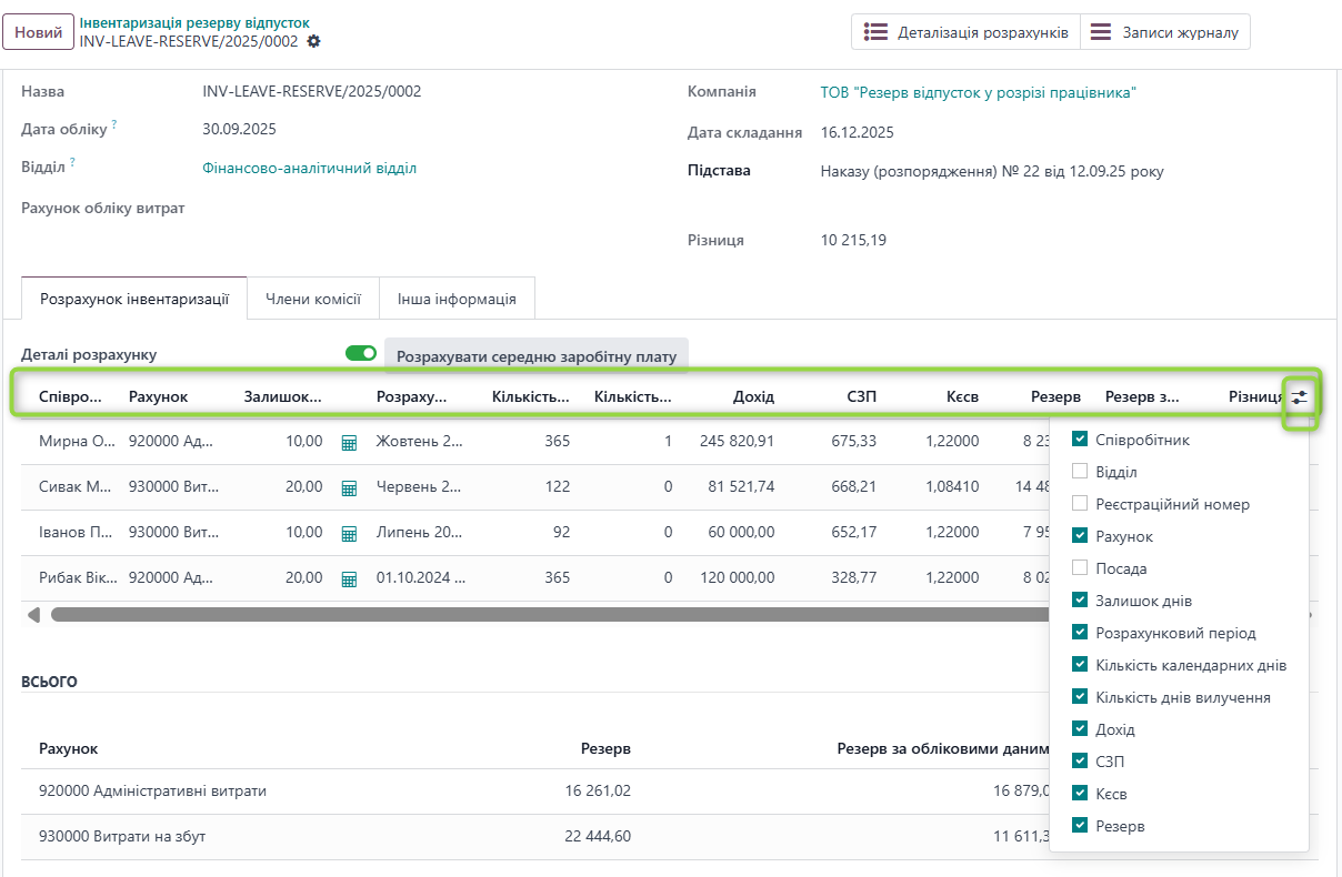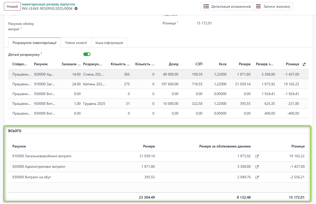 Блок «ВСЬОГО», що розміщується під деталізацією інвентаризаційних розрахунків по працівниках, формує узагальнену інформацію за обліковими рахунками резерву відпусток.