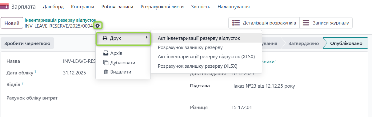 У документі «Інвентаризація резерву відпусток» реалізовано функціонал друку результатів інвентаризації, необхідних для оформлення перевірки залишку резерву: