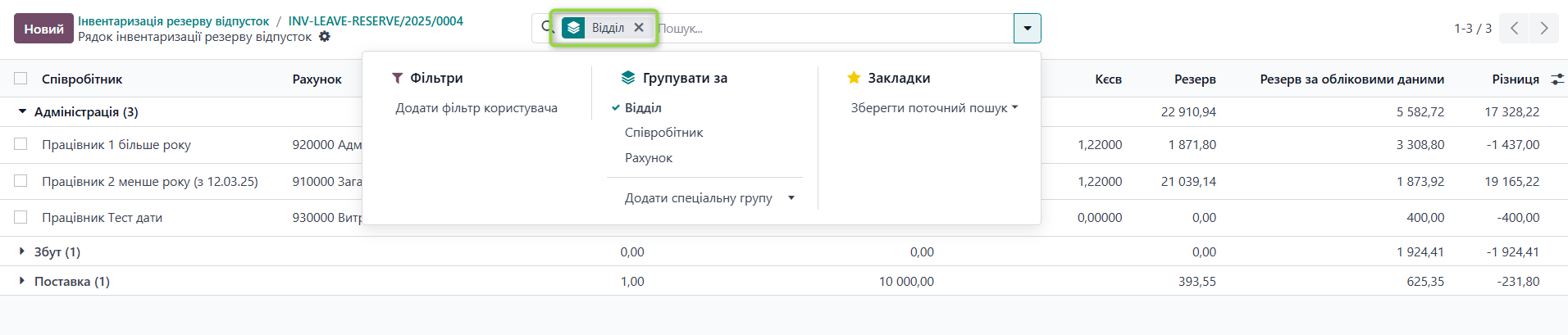 При переході — відображається список здійснених розрахунків резерву відпусток окремо за кожним працівником. Дані за замовчуванням згрупованні за відділами компанії.