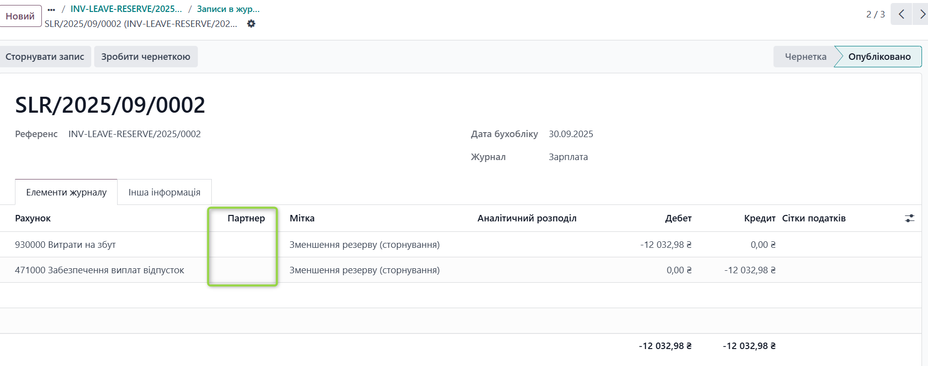 Створенні автоматичні записи коригування суми резерву відпусток на рахунках обліку можна переглянути перейшовши на "Записи журналу" та за необхідності відкоригувати.