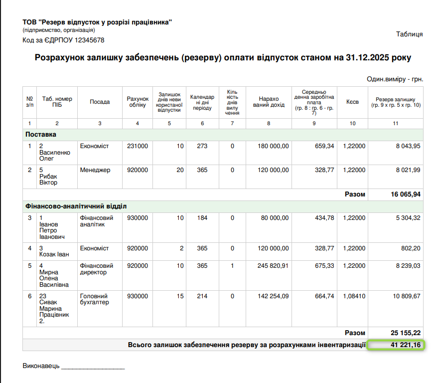 розрахунок залишку забезпечень (резерву) оплати відпусток з відображенням всіх розрахункових даних по кожному співробітнику