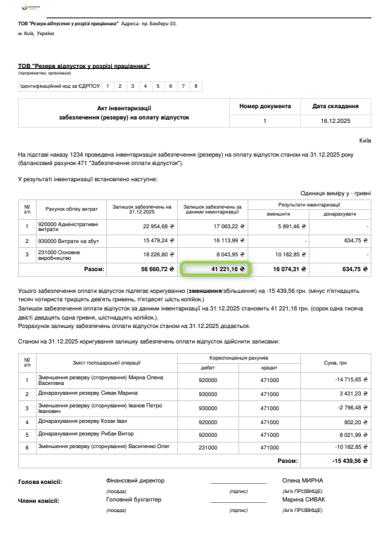 Акт інвентаризації резерву відпусток