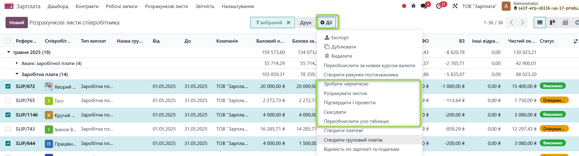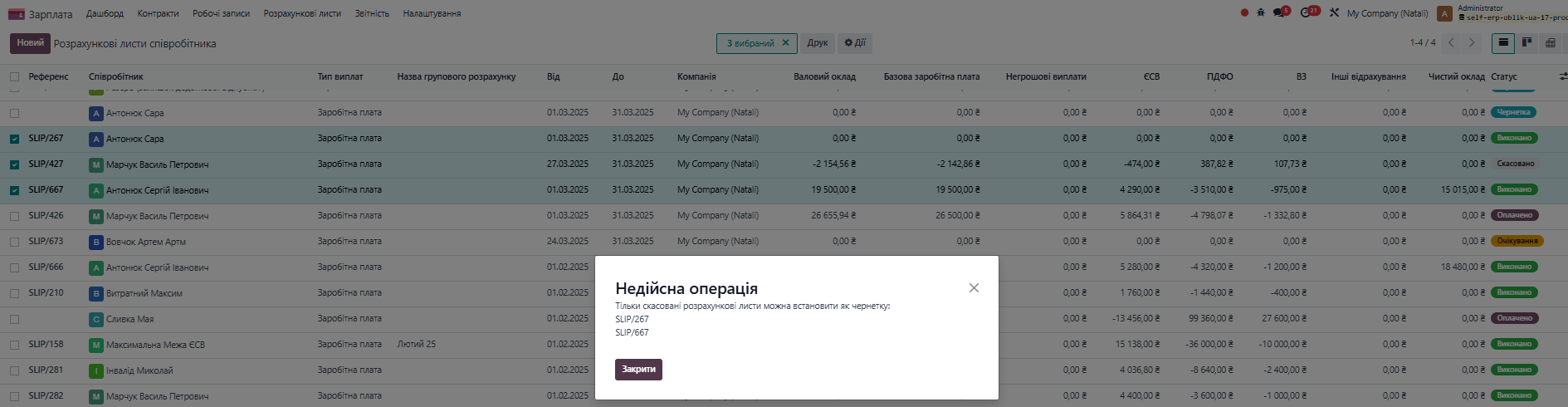 | 1 | Скасувати | Переводить вибрані розрахункові листки у статус Скасовано. | Чернетка, Очікування, Виконано | Скасовано |