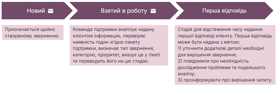 На стадіях “Взятий в роботу” та “Перша відповідь” розраховується SLA для інцидентів та стандартних запитів в залежності від пріоритету та пакету підтримки.