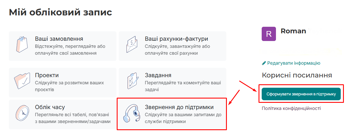 Статус та деталі запиту Ви можете подивитися на Порталі користувача. Також на порталі можна оформити запит на підтримку, скориставшись відповідною кнопкою. Перейдіть за посиланням із запрошення на портал, щоб активувати обліковий запис.