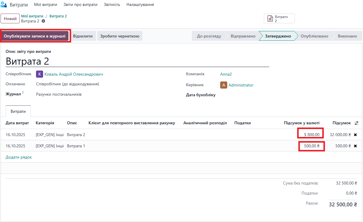 Усі операції автоматично відображаються на відповідних рахунках витрат та на обліковому рахунку підзвітної особи 372102 " Розрахунки з підзвітними особами за непідтвердженими витратами в національній валюті"(372202)