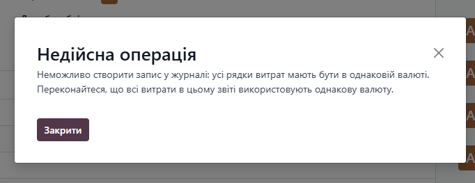 Зверніть увагу! Для забезпечення можливості підтримувати валютні операції в авансовому звіті, існує обмеження на створення звіту витрати, що містить різні валюти.(наприклад одночасно витрату у гривні і витрату у доларах). При підтвердженні публікації запису в бухгалтерському журналі з'являється попередження