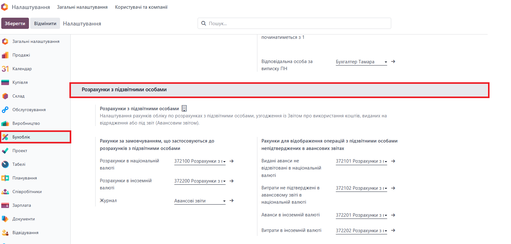 Налаштування/ Бухоблік/Розрахунки з підзвітними особами