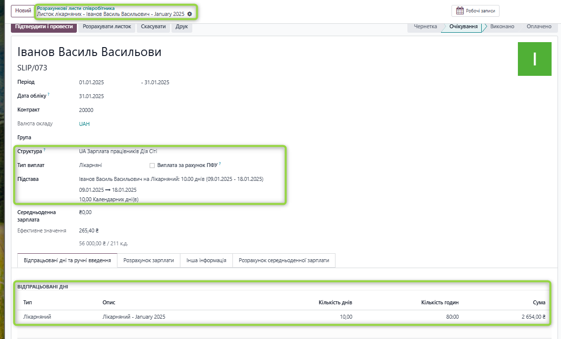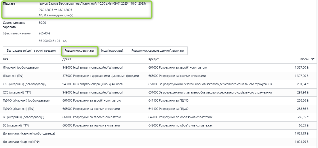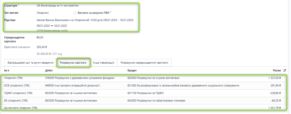 У вкладці "Розрахунок зарплати" цього гіг-спеціаліста буде нарахована сума, яка виплачується за рахунок Пенсійного Фонду, починаючи з 6 дня, тоді як перші п’ять днів тимчасової непрацездатності в розрахунковому листі нараховані не будуть.