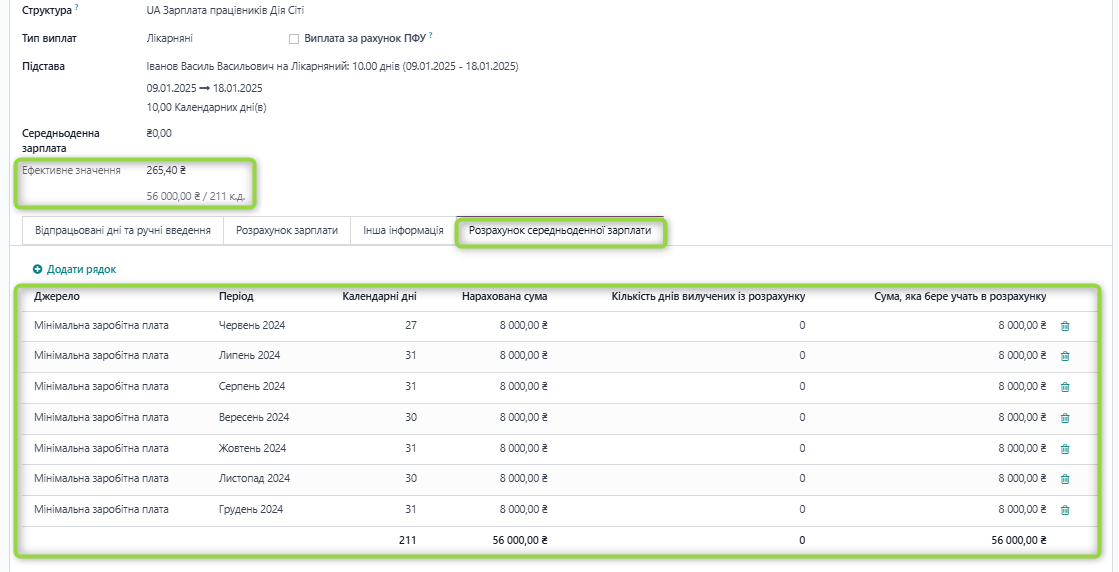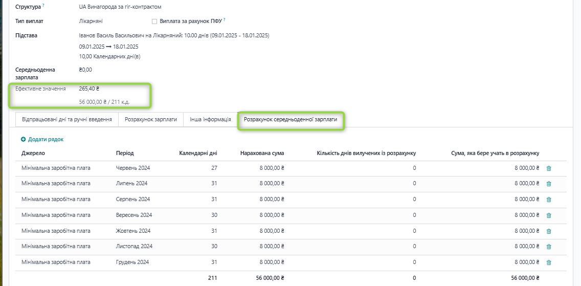 Користувач має можливість вказати вручну середньоденну зарплату або система автоматично розраховує її та відображає в полі "Ефективне значення".