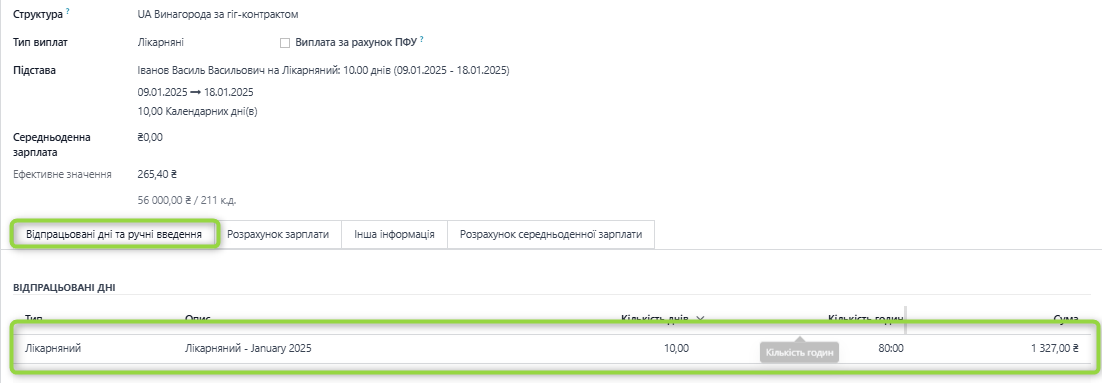 Після розрахунку - на вкладці "Відпрацьовані дні та ручні введення" відображається кількість днів, вказана в листку непрацездатності.