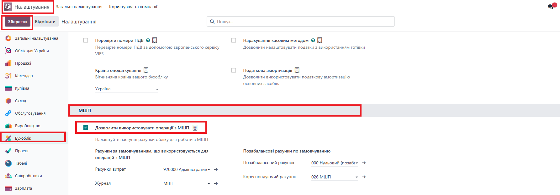 Для активації функціоналу Обліку МШП перейдіть в Загальні налаштування бухобліку та поставте галочку у розділі МШП, "Дозволити використовувати операції з МШП" та збережіть налаштування.