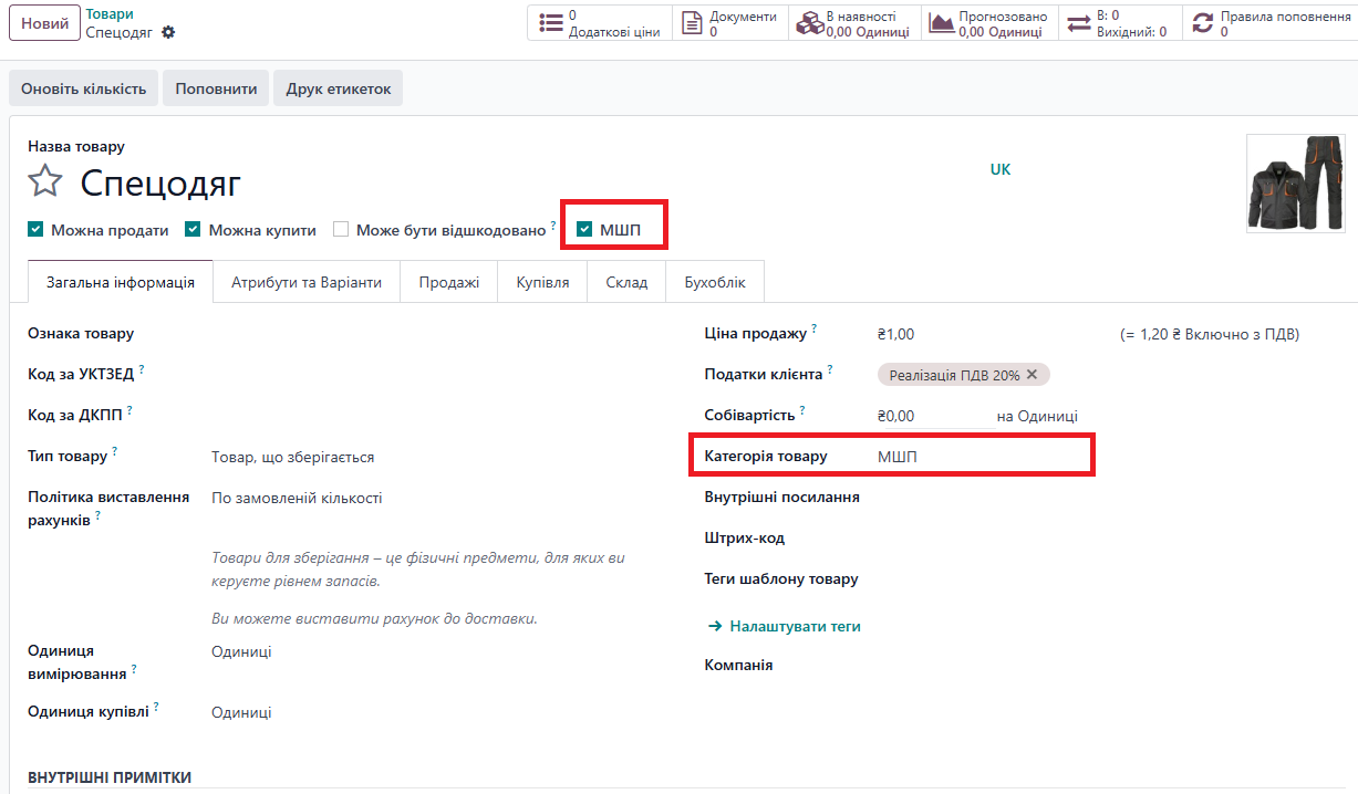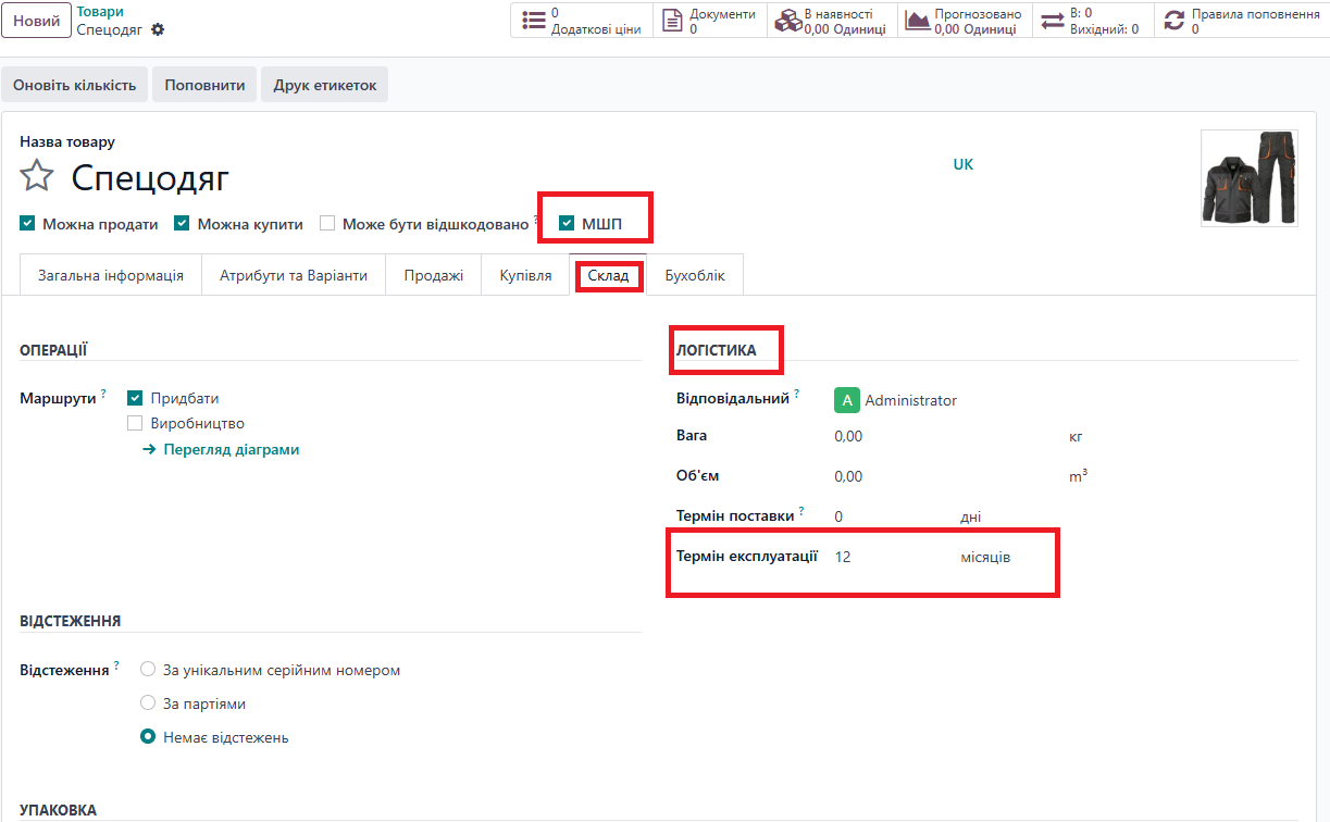Також, якщо в товарі активна галочка МШП, на вкладці Склад у розділі логістика автоматично з'являється поле Термін експлуатації (МШП), де автоматично проставляється 12 місяців. При потребі це значення можна змінити, залежно від конкретного товару, що відноситься до МШП.