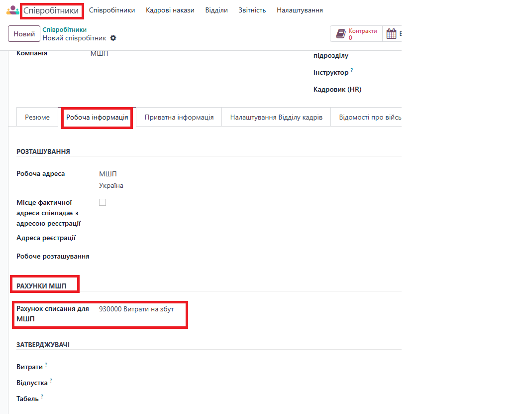 В системі існує основне налаштування рахунку списання МШП, і воно знаходиться в загальних налаштуваннях бухобліку, розділ МШП. Але бувають випадки, коли необхідно вказати рахунок списання для конкретного співробітника. Щоб зробити це, потрібно зайти в меню Співробітники, знайти картку відповідного співробітника і перейти на вкладку Робоча інформація>Рахунки МШП і обрати Рахунок списання для МШП з випадаючого списку плану рахунків.