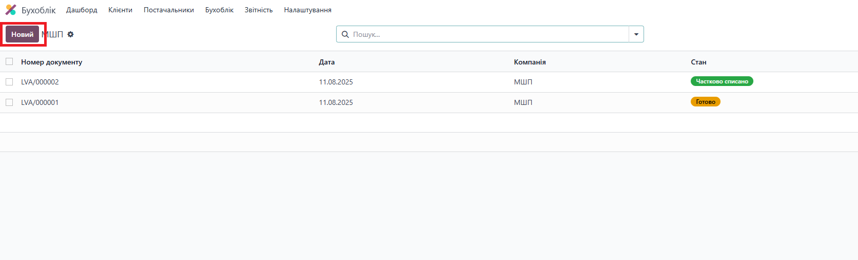 Після натиснення на пункт меню Документи МШП, якщо в системі були раніше створені документи, то Ви побачите список цих документів, якщо ні - то порожній список і кнопку Новий