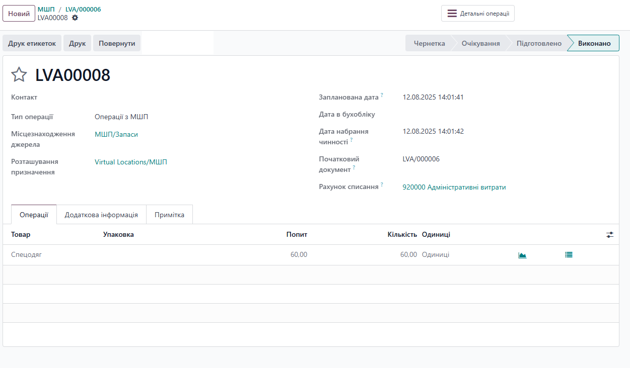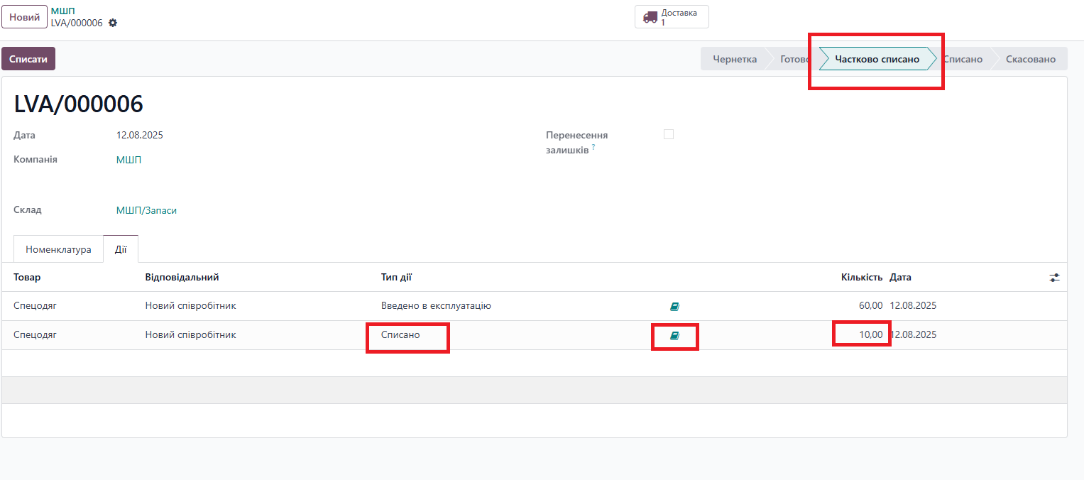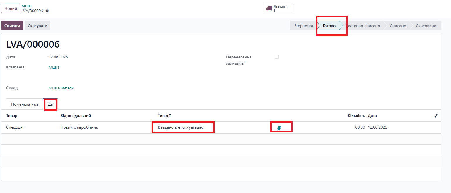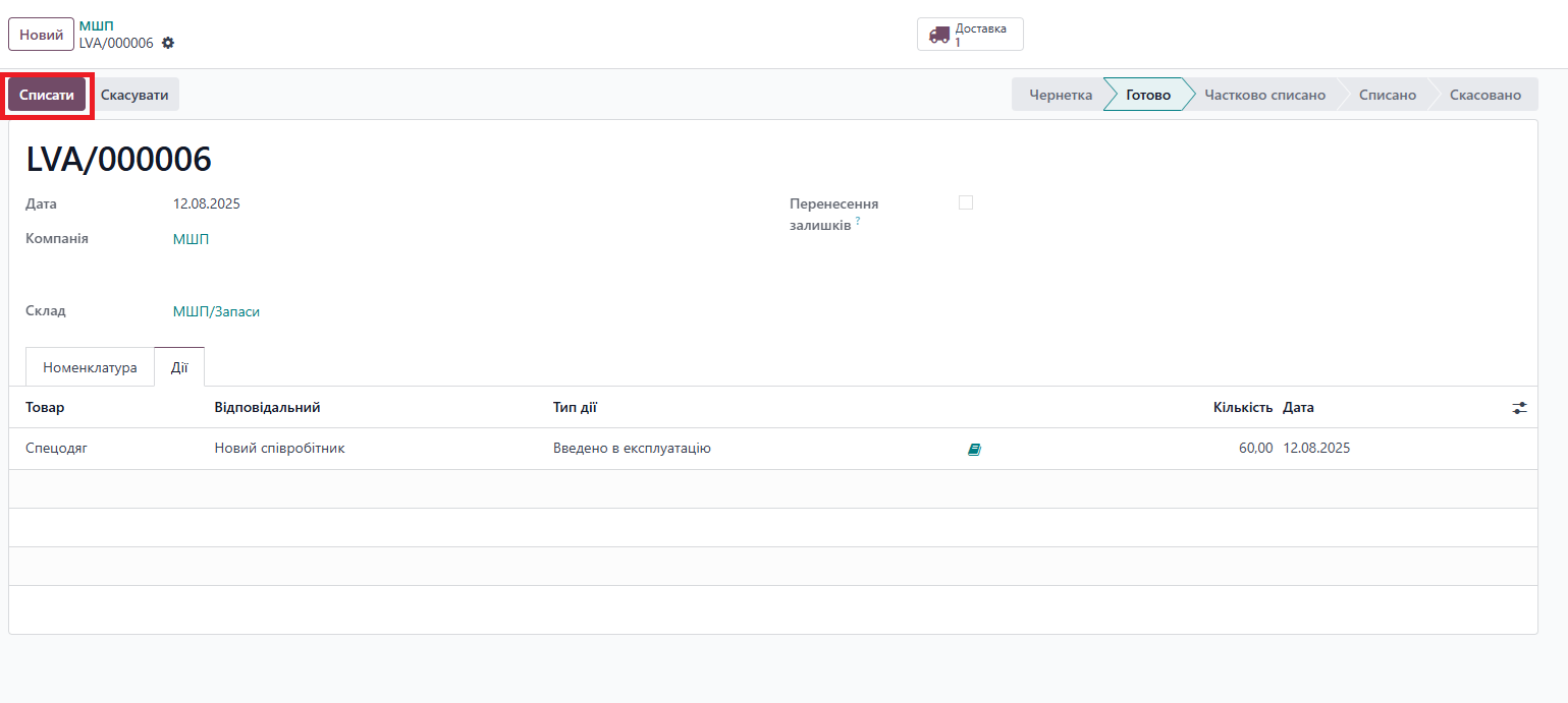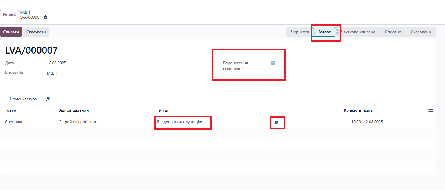 - Автоматично створюється і підтверджується складське переміщення і товар МШП кількісно списується зі складу
