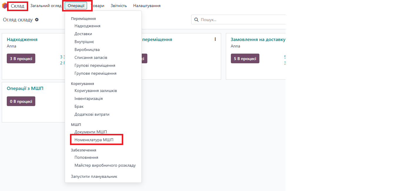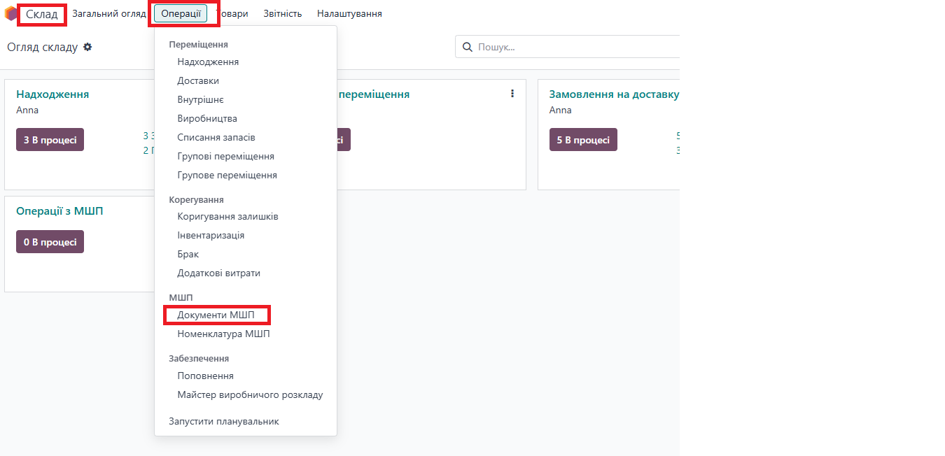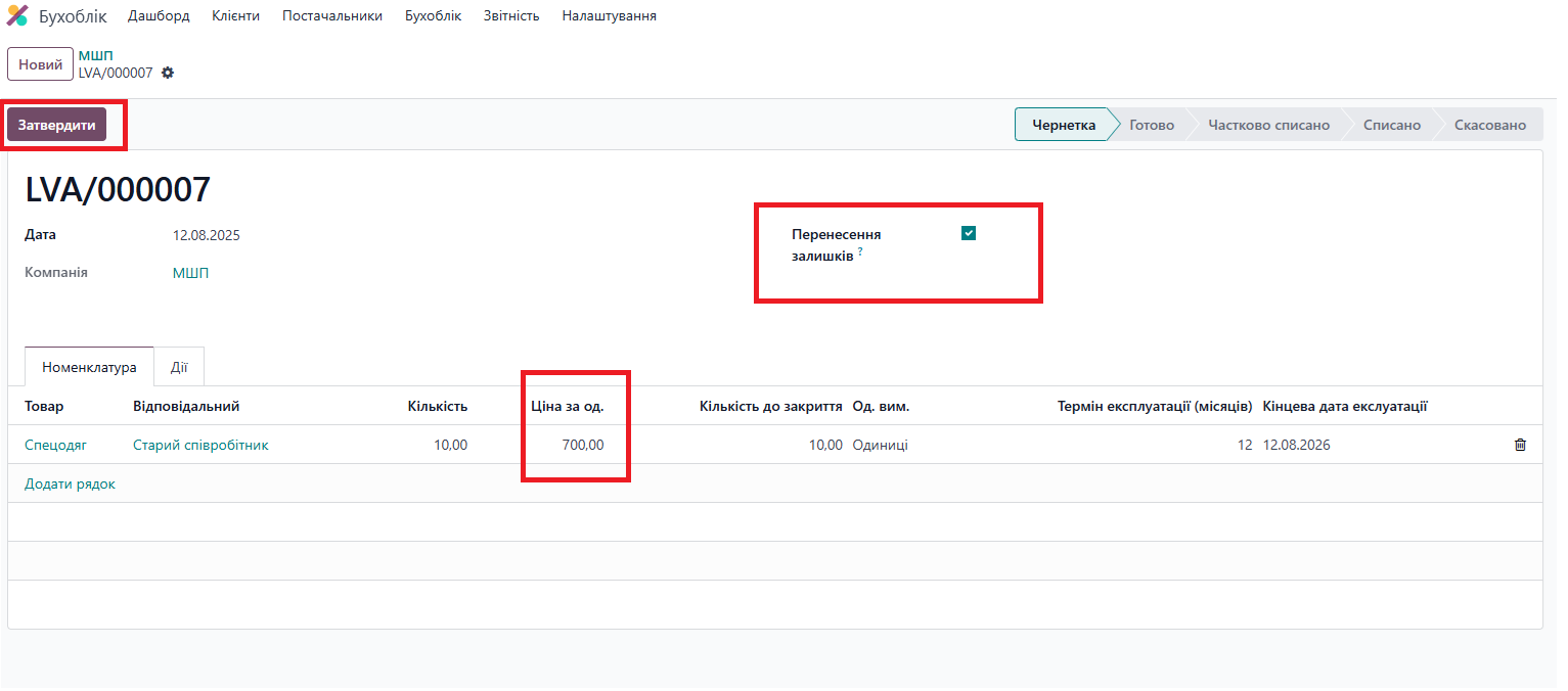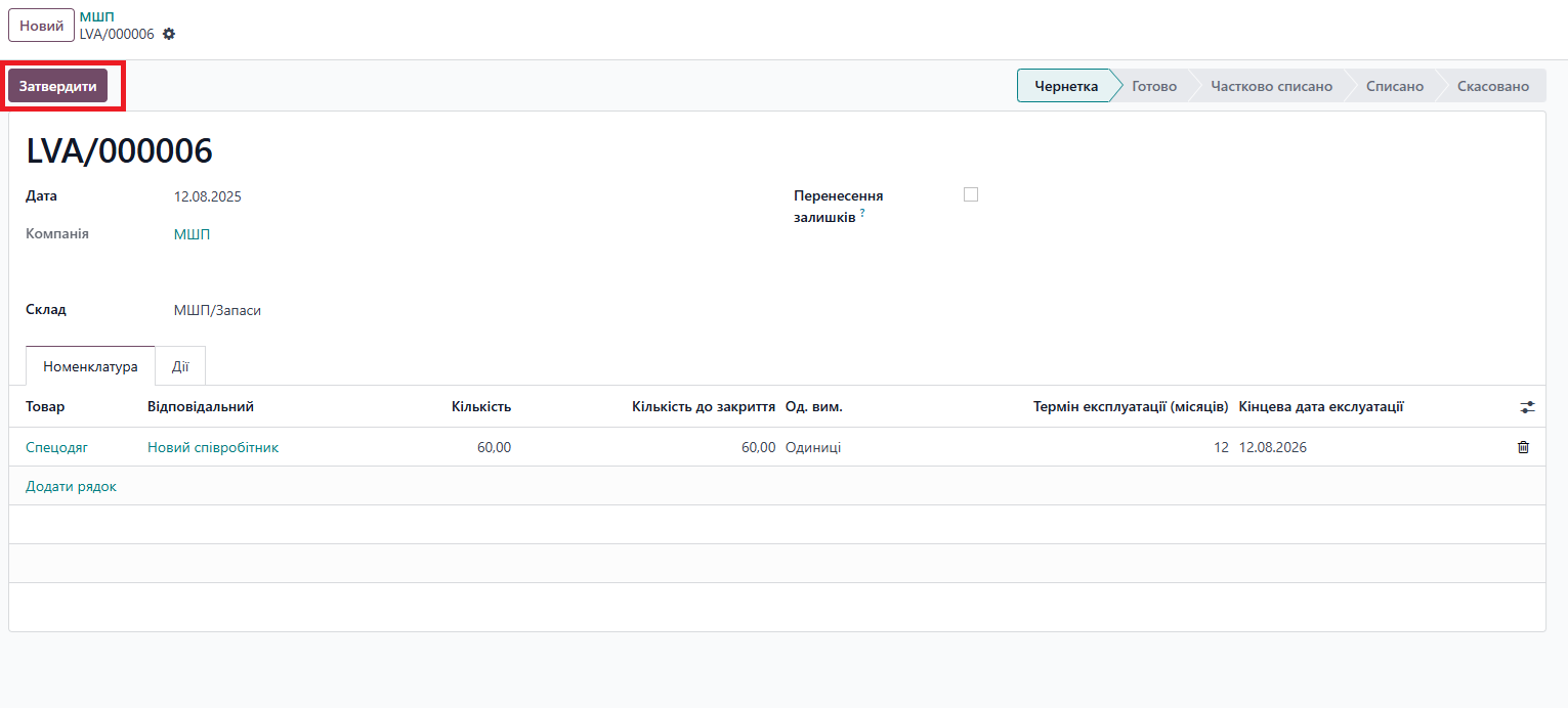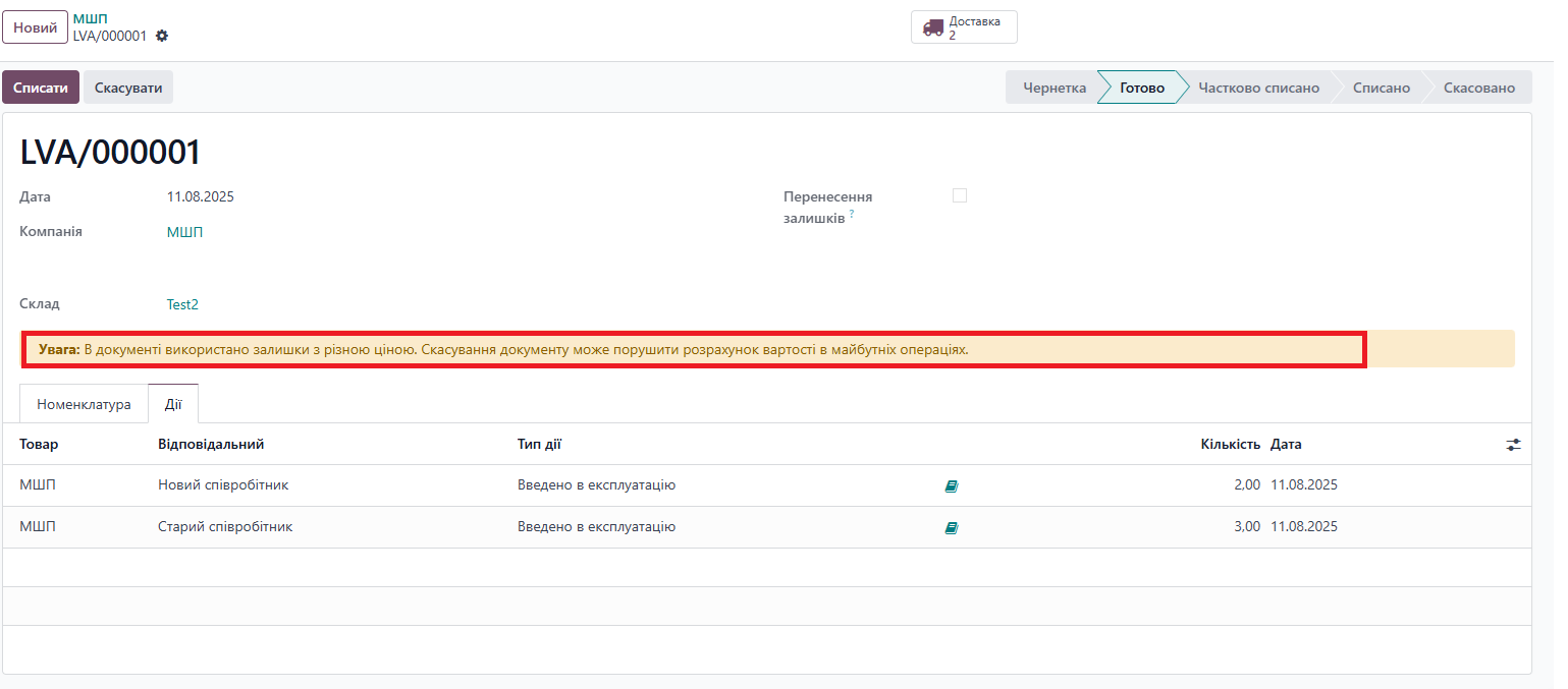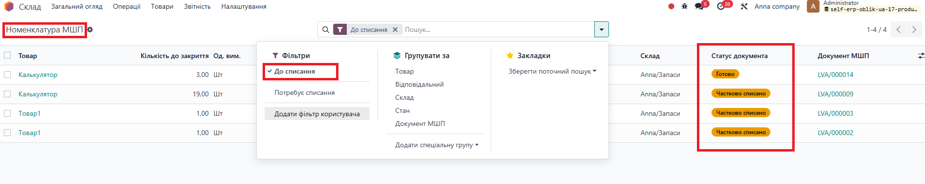 - Автоматично створюється і підтверджується складське переміщення і товар МШП кількісно списується зі складу