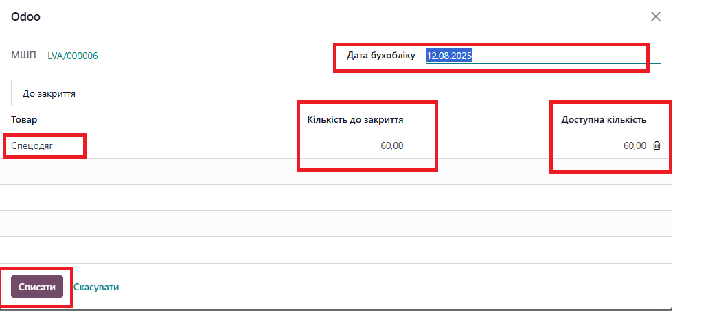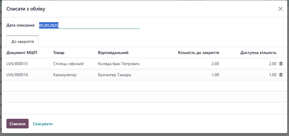 - Доступна кількість - заповниться автоматично з документом (максимальна кількість, яку можна списати)