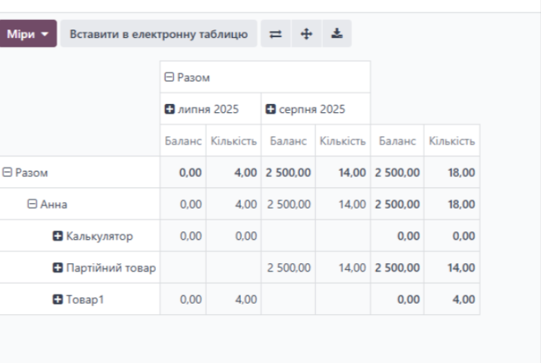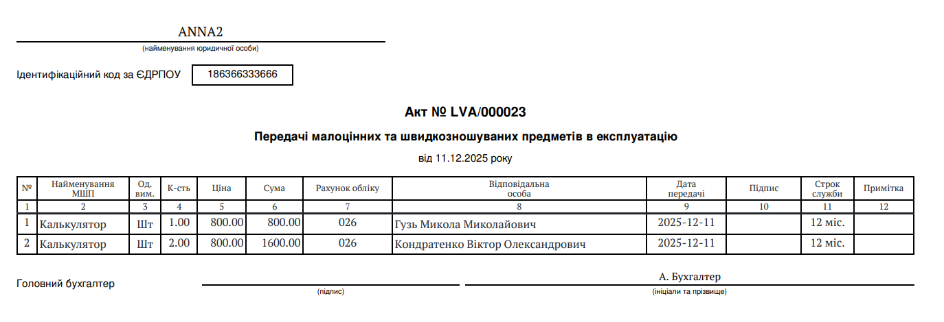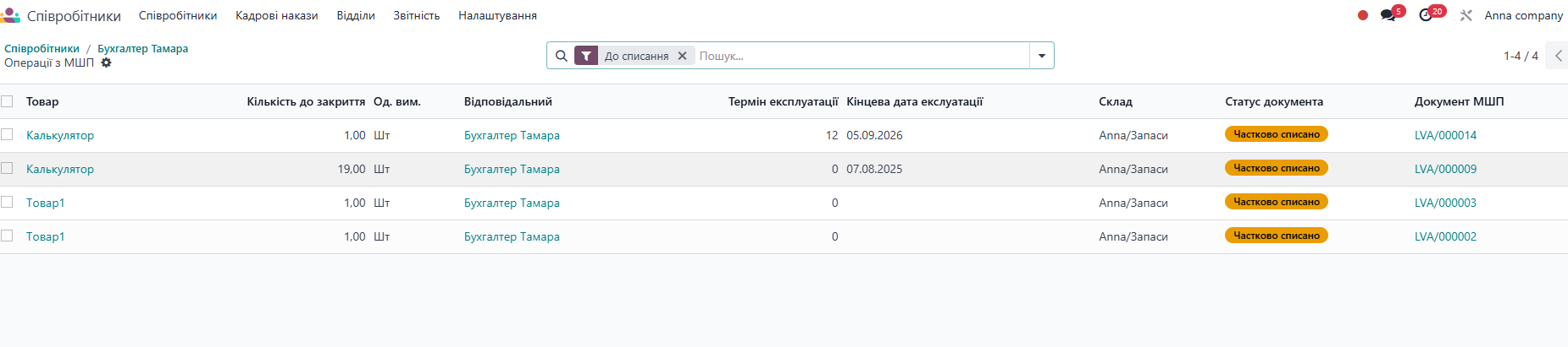 Це дозволяє отримати агрегований звіт, який показує не лише загальну кількість введених у експлуатацію МШП, але і їх розподіл за відповідальними особами та номенклатурою товарів.