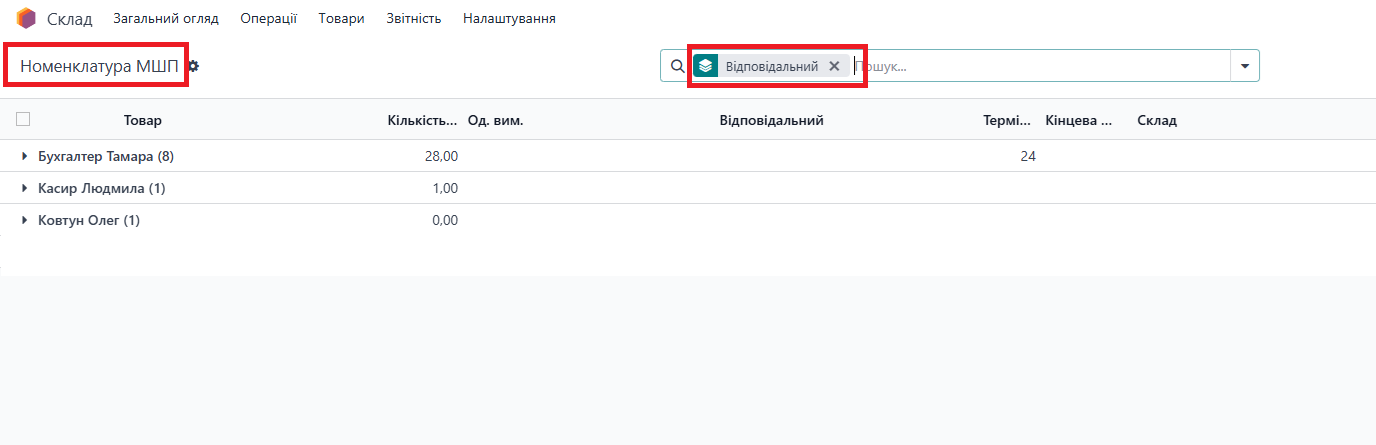 Перейшовши в це меню, по замовчуванню всі товари МШП, будуть зруповані по відповідальній особі