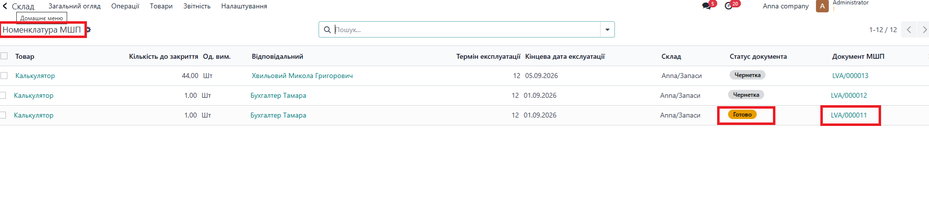 Якщо прибрати фільтр по відповідальній особі, то відкриється список з усіх товарів, що були включені в документи Операції з МШП, з необхідною інформацією по кожному товару, статусом самого документу, та можливістю перейти з товару в докумет, що включає його.