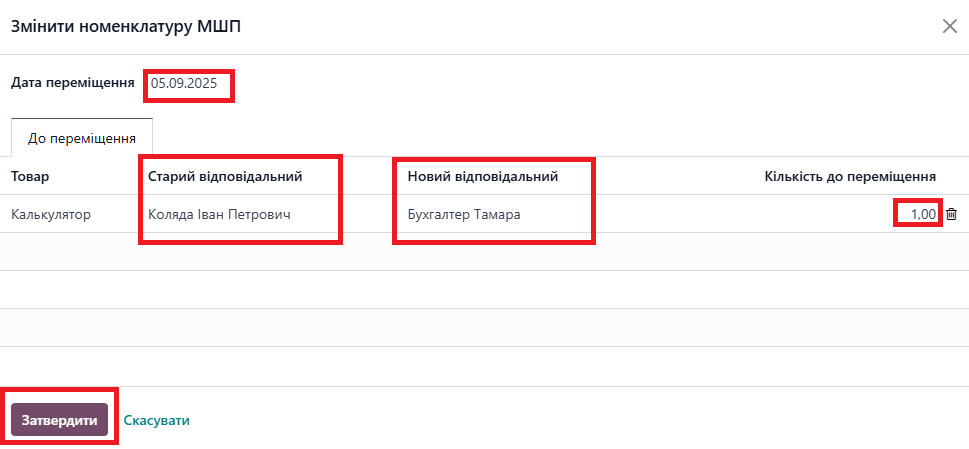 Після цього з'являється вспиливаюче вікно, в якому не обхідно заповнити Дату переміщення на іншу відповідальну особу, нового відповідального та кількість товару до переміщення, та натиснути кнопку Затвердити.