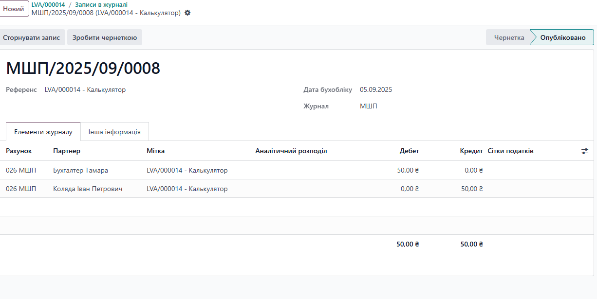 Після цього в системі буде створено бухгалтерський запис (Ви можете переглянути його на вкладці Дії):
