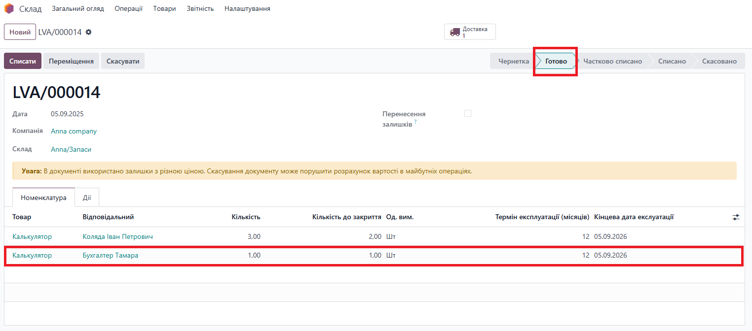 🔍Відображає кількість, яка зараз перебуває у відповідального, і яку можна ще списати