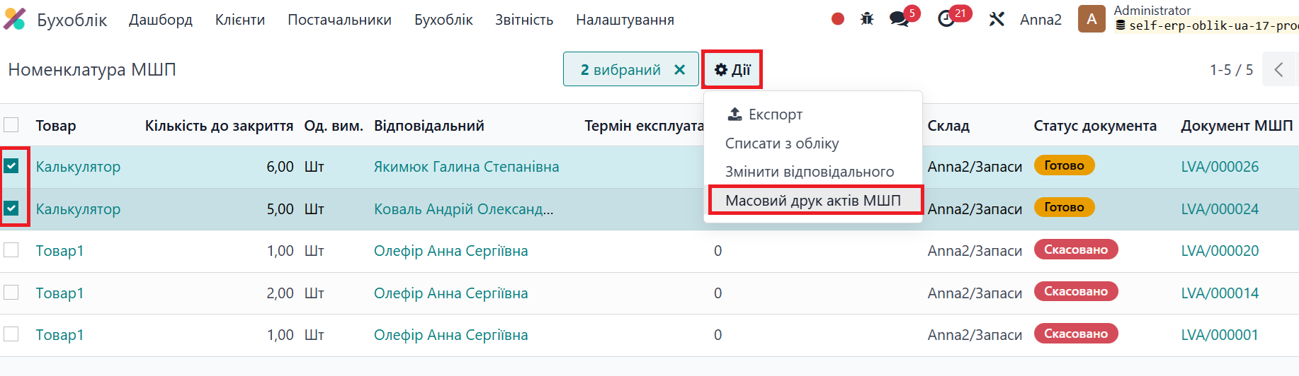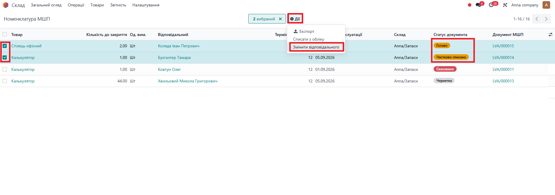 Перейдіть у меню Номенклатура МШП, оберіть кілька документів, що мають статуси Готово або Частково списано та через Дію оберіть пункт меню Змінити відповідального