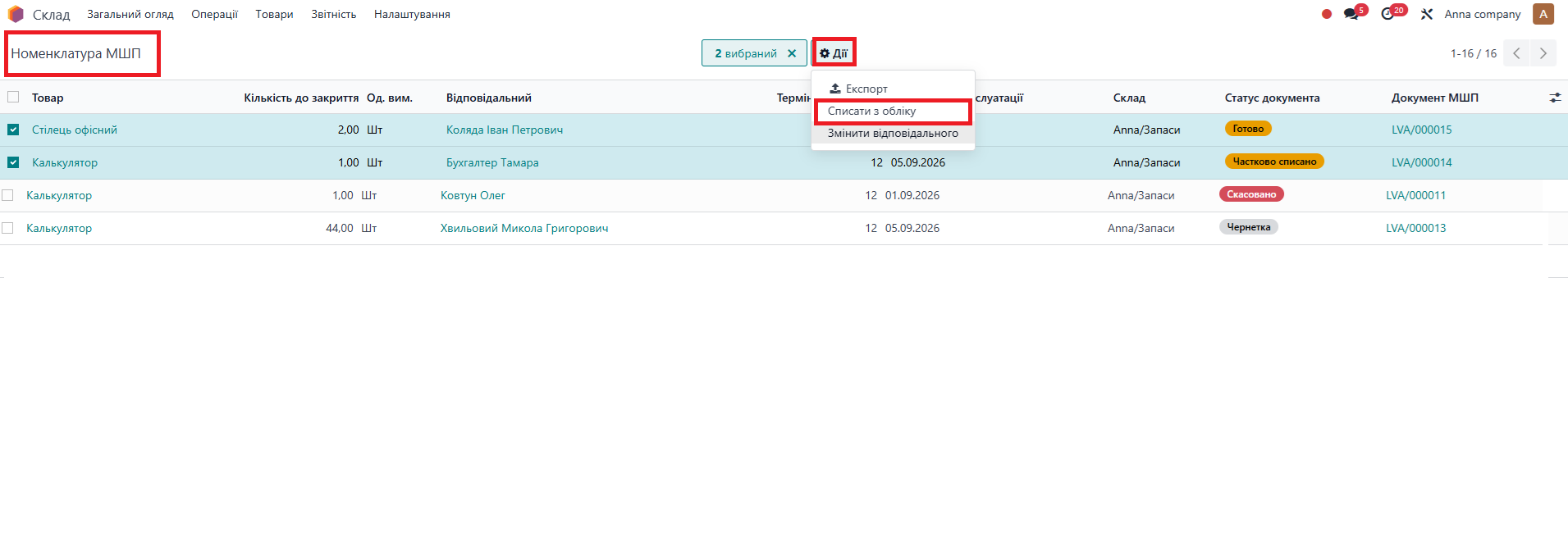 Перейдіть у меню Номенклатура МШП, оберіть кілька документів, що мають статуси Готово або Частково списано та через Дію оберіть пункт меню Списати з обліку