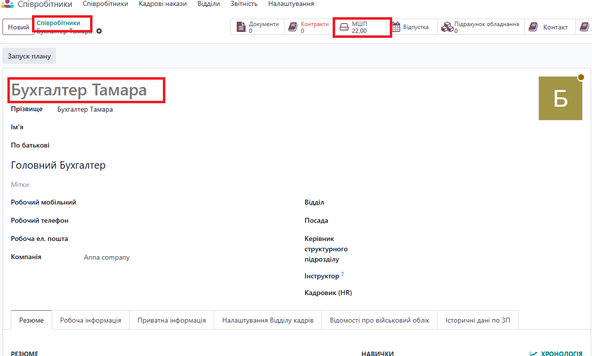 Для зручності користувача, було додано смарт кнопку на картку співробітника, що показує кількість МШП, передану цьому співробітнику