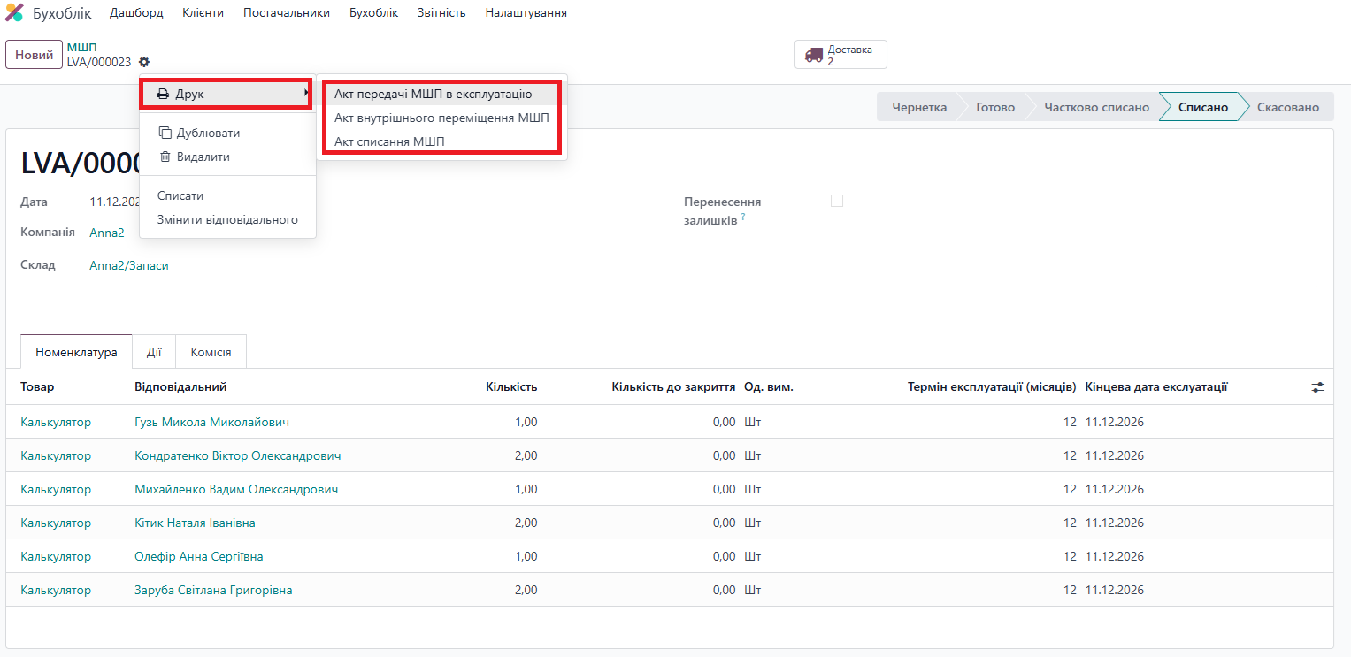 Також, з даного меню, можливі такі групові операції як Переміщення між відповідальними особами та Списання МШП. Детальніше це описано нижче у відповідних пунктах.