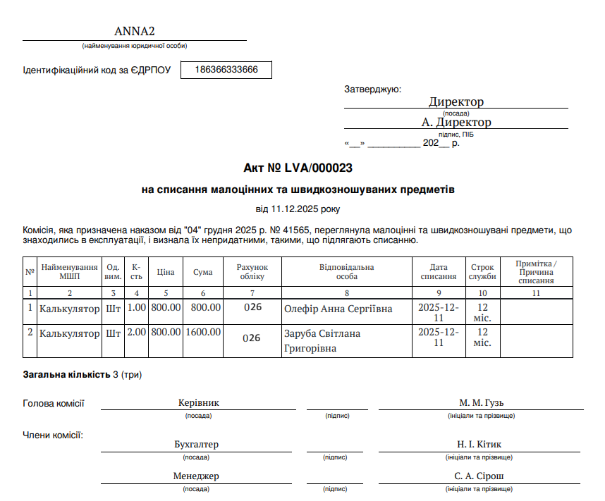 Формується з даних документа, проведень та вкладки «Комісія». В поле "Затверджую" Підтягуються дані про Директора, вказаного на картці компанії.