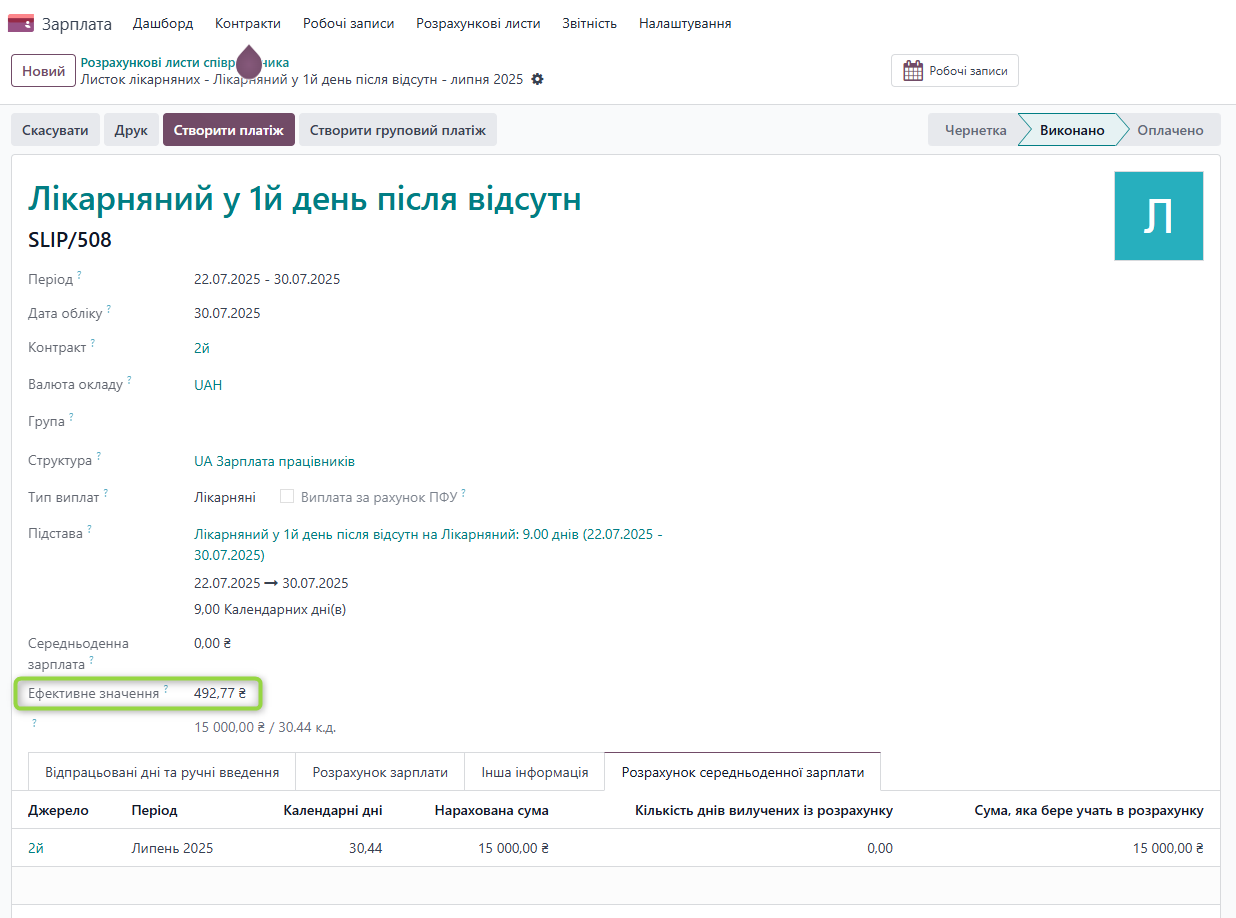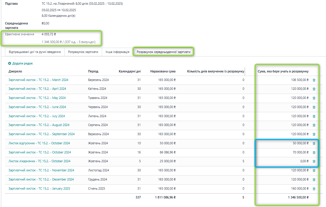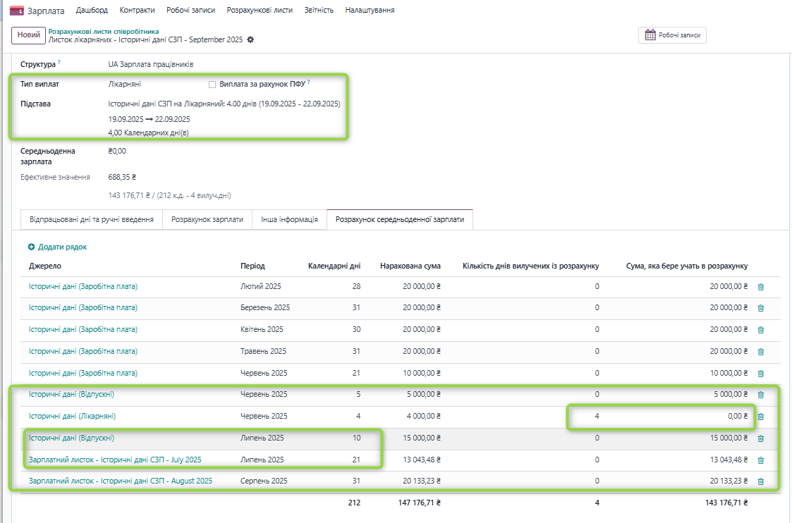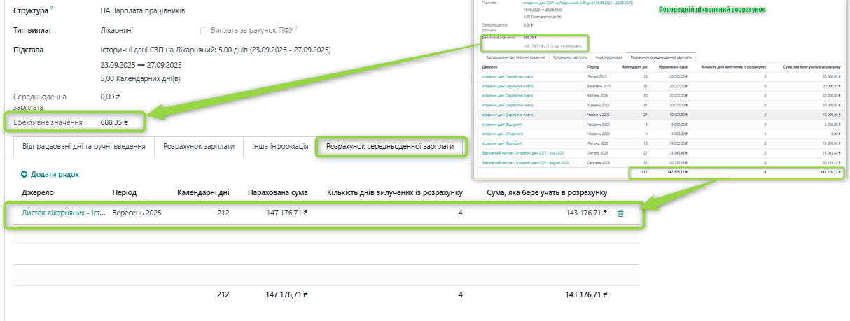 Розрахунок: Розрахунок СЗП для оплати лікарняного враховує дані з джерел історичних та розрахункових записів в системі.