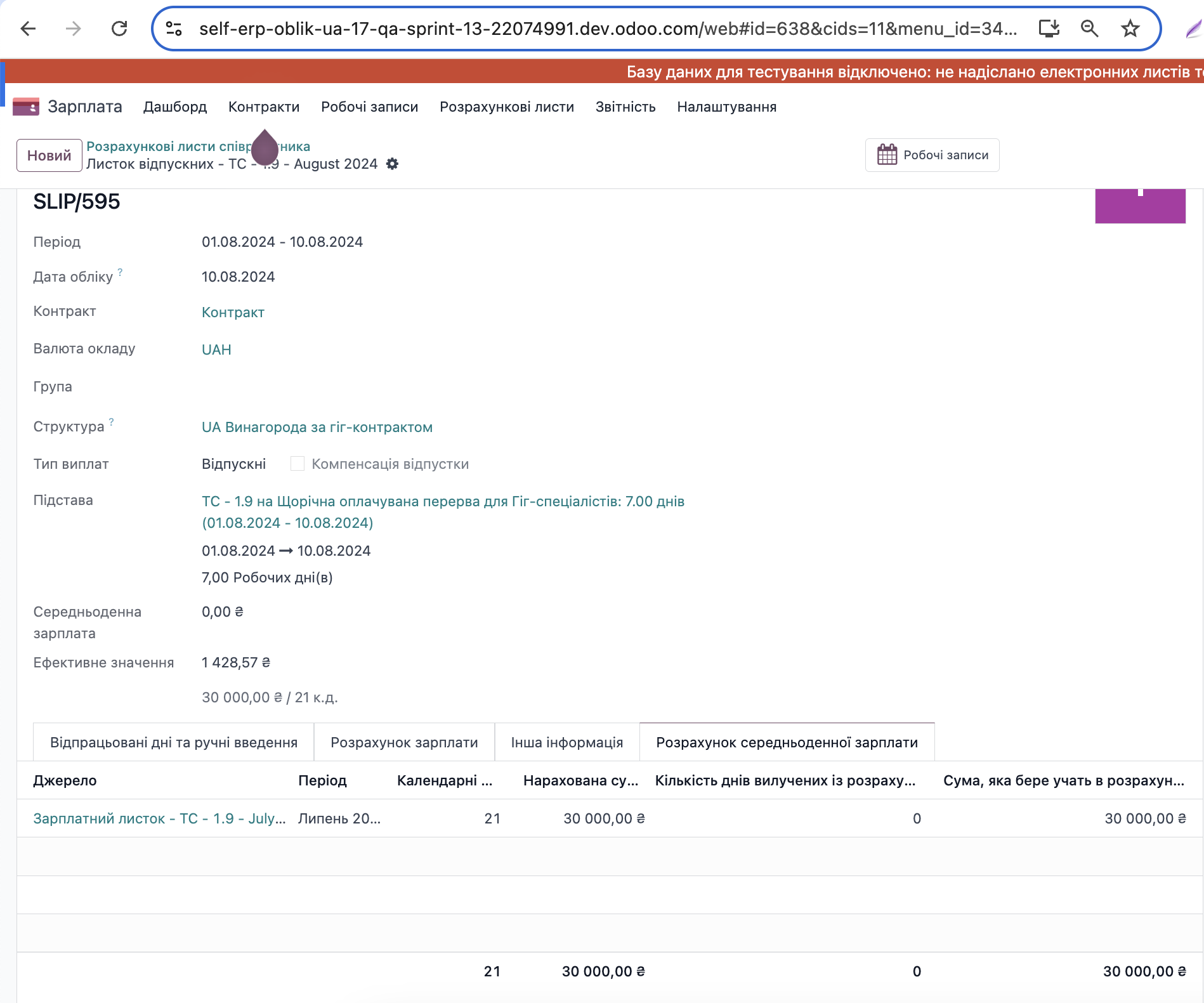 Щорічна оплачувана перерва для Гіг-спеціаліста зафіксована в модулі Відпустка з 01.08.2024-10.08.2024 на 7 роб. днів.