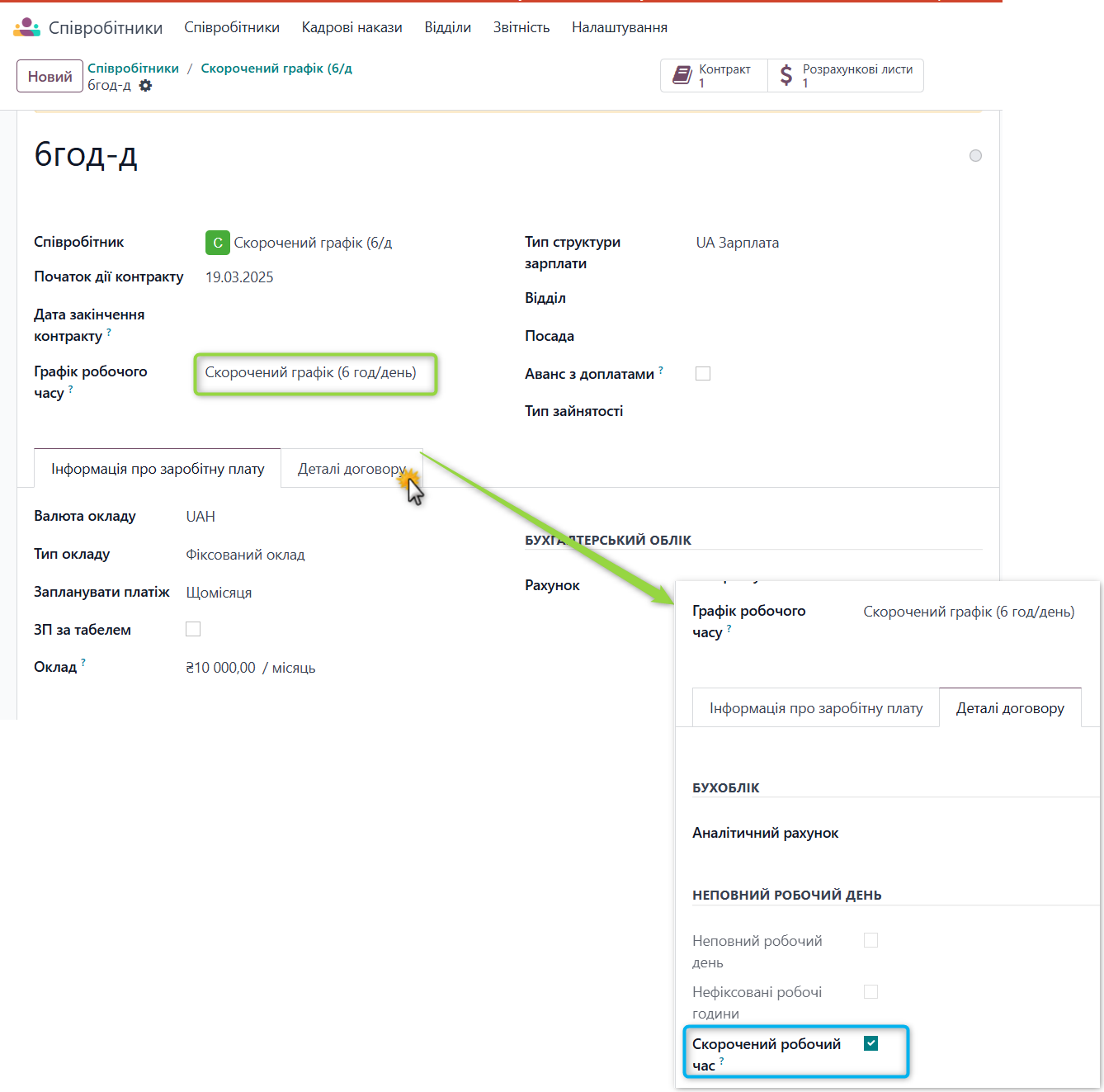 Відмітка у контракті : деталі договору - блок "неповний робочий день"- відмітка - "Скорочений робочий час"