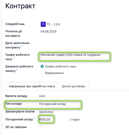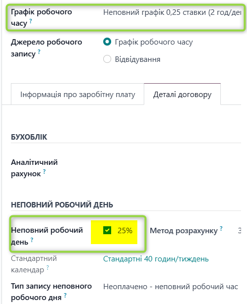 В контракті працівника активне поле неповний робочий день, де є значення % зайнятості time_credit,= 0.25