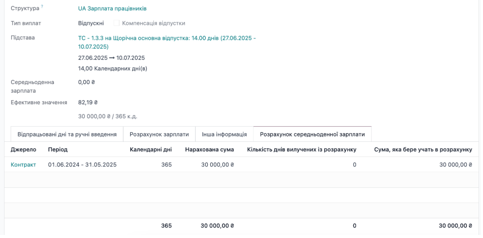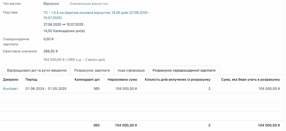 Для розрахунку СЗП розрахунковий період (умовний) 01.06.24-31.05.25. За цей період на підприємстві 2 офіційні вихідні. Оклад по посаді працівника 10 000 грн. Графік роботи на повну оплату, тому розрахунок: