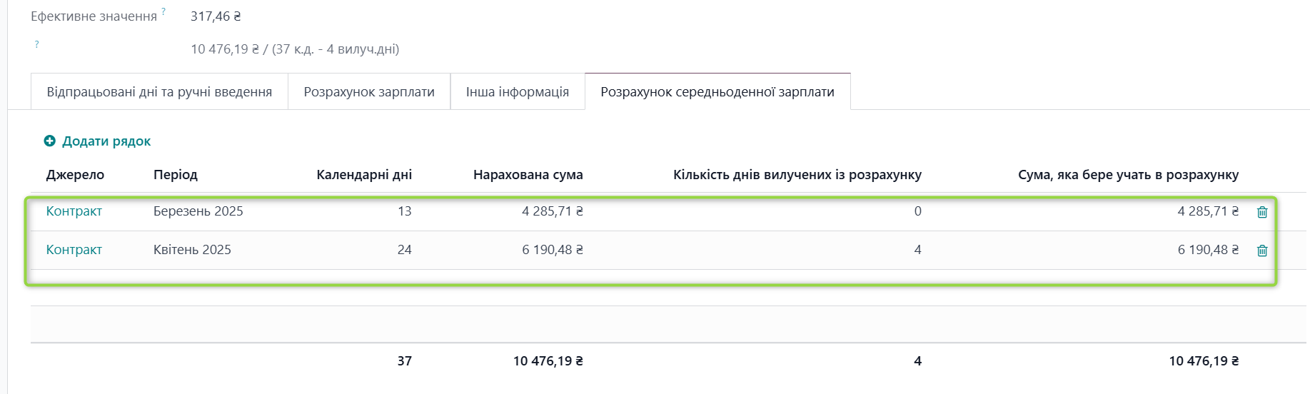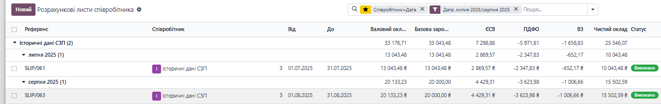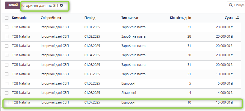 2. Внесенні історичні дані по ЗП працівника за період роботи січень 25 - червень 25 року.