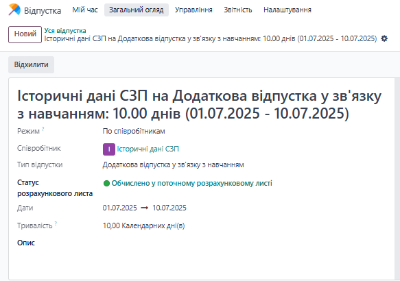 3. Зафіксована відсутність працівника за липень 2025р (на к-сть днів липня 2025), для коректного відображення відвідування та нарахування заробітної плати: