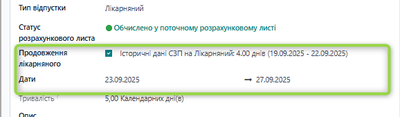 В системі внесено відсутність, тип відпустки Лікарняний, відмічено Продовжений.