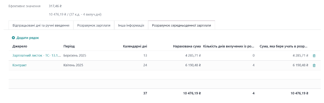 Якщо в системі відсутні розрахунки по заробітній платі за фактично відпрацьований період часу (розрахункові листи) - то для розрахунку суми за відпрацьовані дні джерелом є контракт працівника. Розрахунок нарахування суми доходу здійснюється з врахуванням посадового окладу (тарифу), графіка роботи працівника за нормою робочого часу, та відповідно к-сть робочих днів (годин) за відпрацьований період.