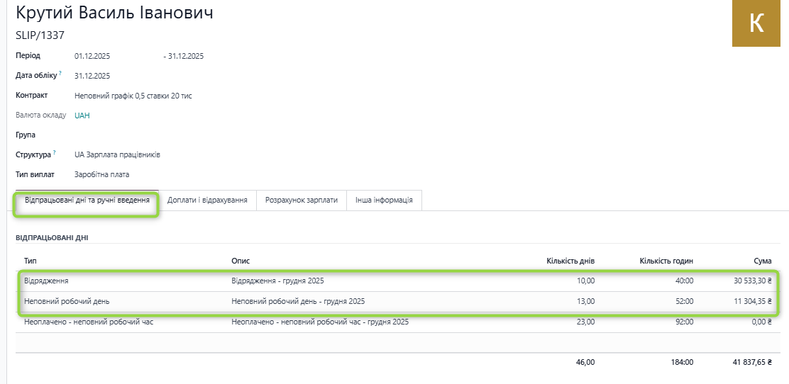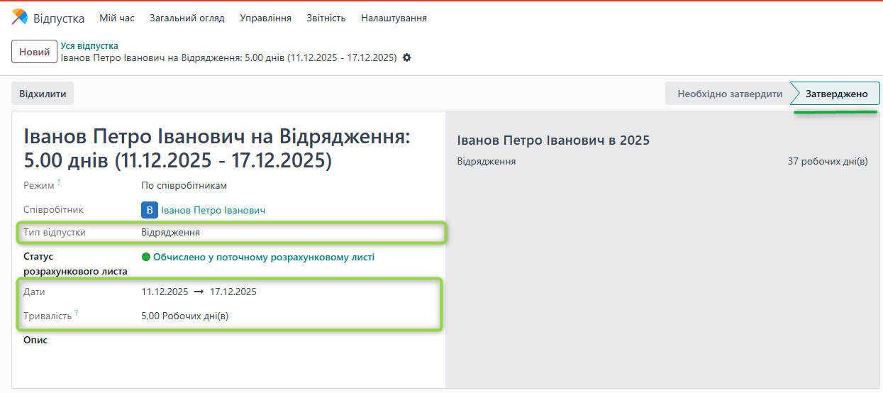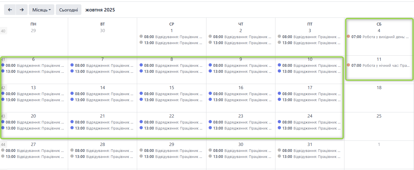 Жовтень 2025 р.: Відрядження 15 роб.днів, Відвідування 8 днів, 1 д. Робота у вихідний, 1 день робота у нічний час: