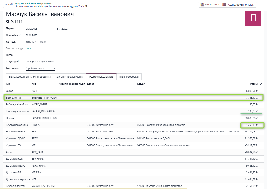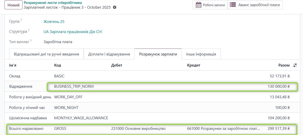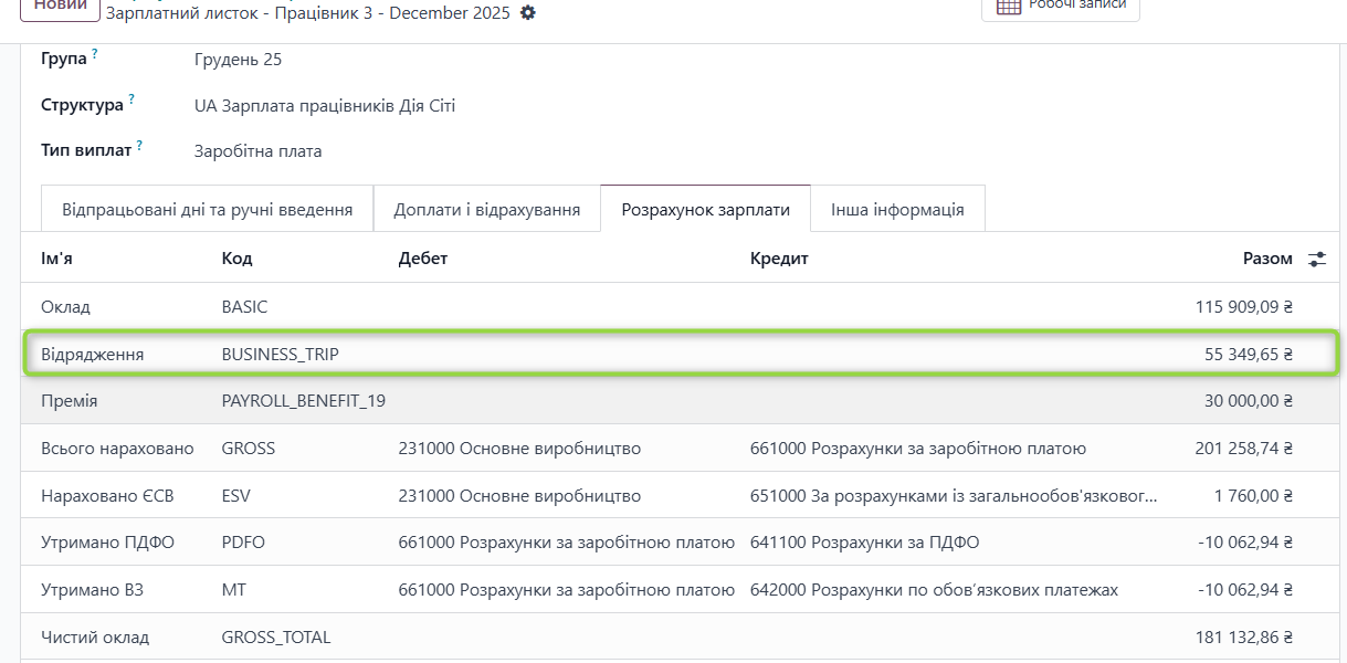Нарахована сума відрядження відображається у розрахунковому листку як складова заробітної плати та включається до загальної суми нарахувань (GROSS), що підлягають оподаткуванню відповідно до налаштувань структури заробітної плати (ПДФО, ВЗ, ЄСВ) та враховуються при формуванні фонду оплати праці.