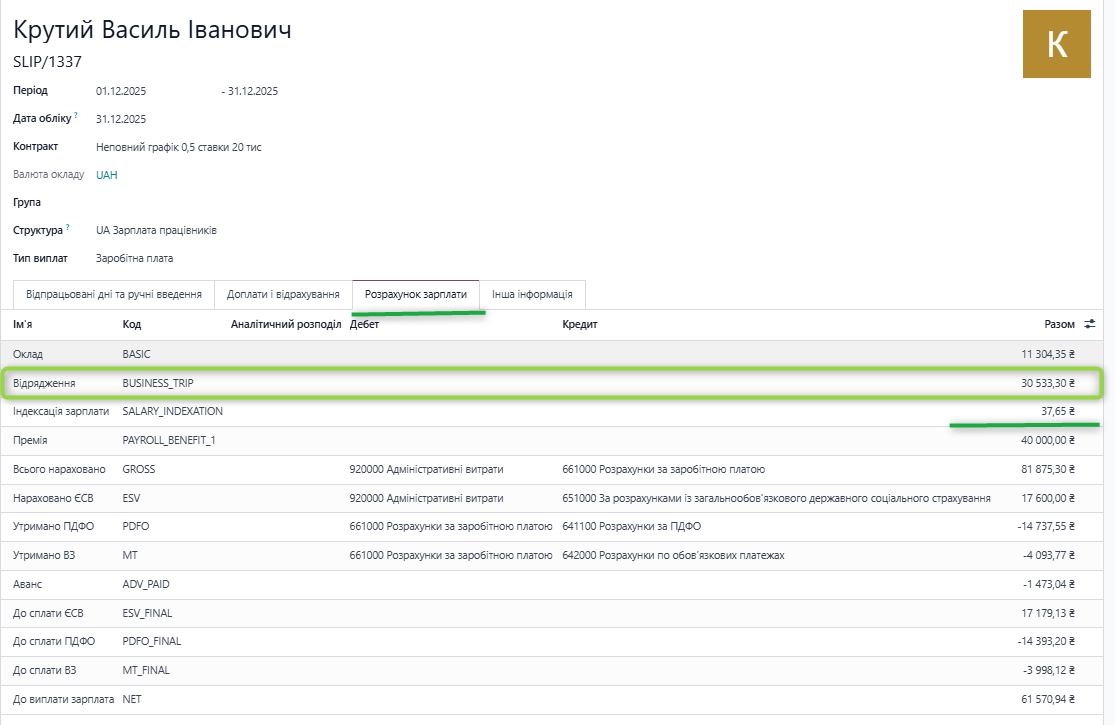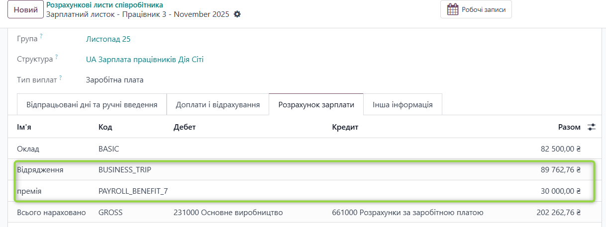 У листопаді - сума відрядження нарахована за СЗП (BUSINESS_TRIP), тому сума та дні будуть вираховуватись із розрахунку СЗП для нарахування оплати відряджень у грудні 2025р. Також, сума премії 30 000 грн за місяць - буде пропорційно врахована відповідно відвідування у розрахунковому періоді.