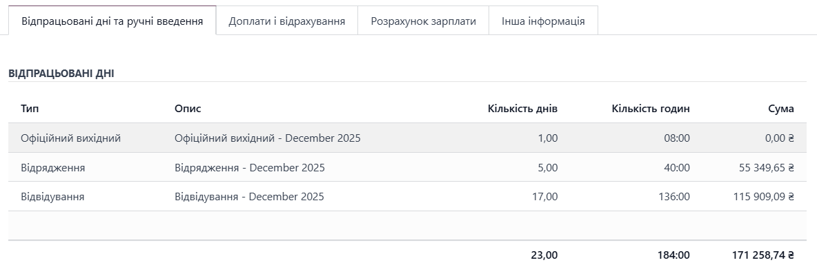Розрахунок відряджень виконується автоматично під час нарахування заробітної плати після фіксації робочих записів та відповідно до налаштувань контракту працівника.