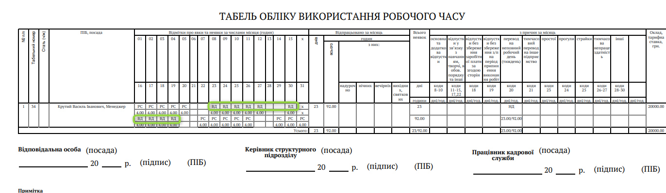 У друкованій формі табеля обліку робочого часу такі дні відображаються з позначенням ВД.